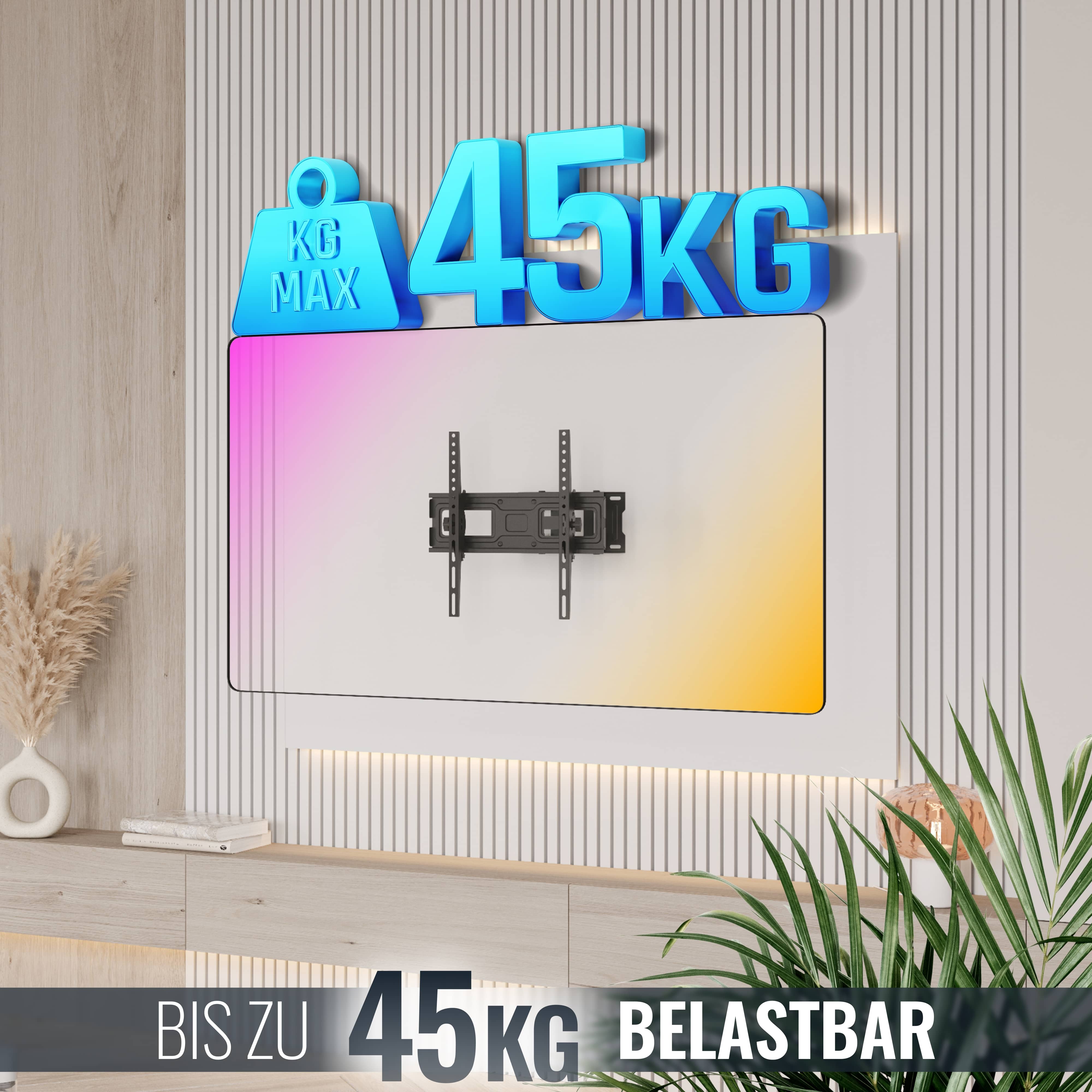 Bis zu 45 KG nimmt diese Fernseh-Wandhalterung an Bildschirmgewicht auf. Dabei können Sie Ihren Fernseher mit einer Breite bis 80cm um 120° horizontal schwenken und -/+15° neigen. Mehrere Raumbereiche erreichen Sie mit diesen Möglichkeiten für den Blick auf den Bildschirm.