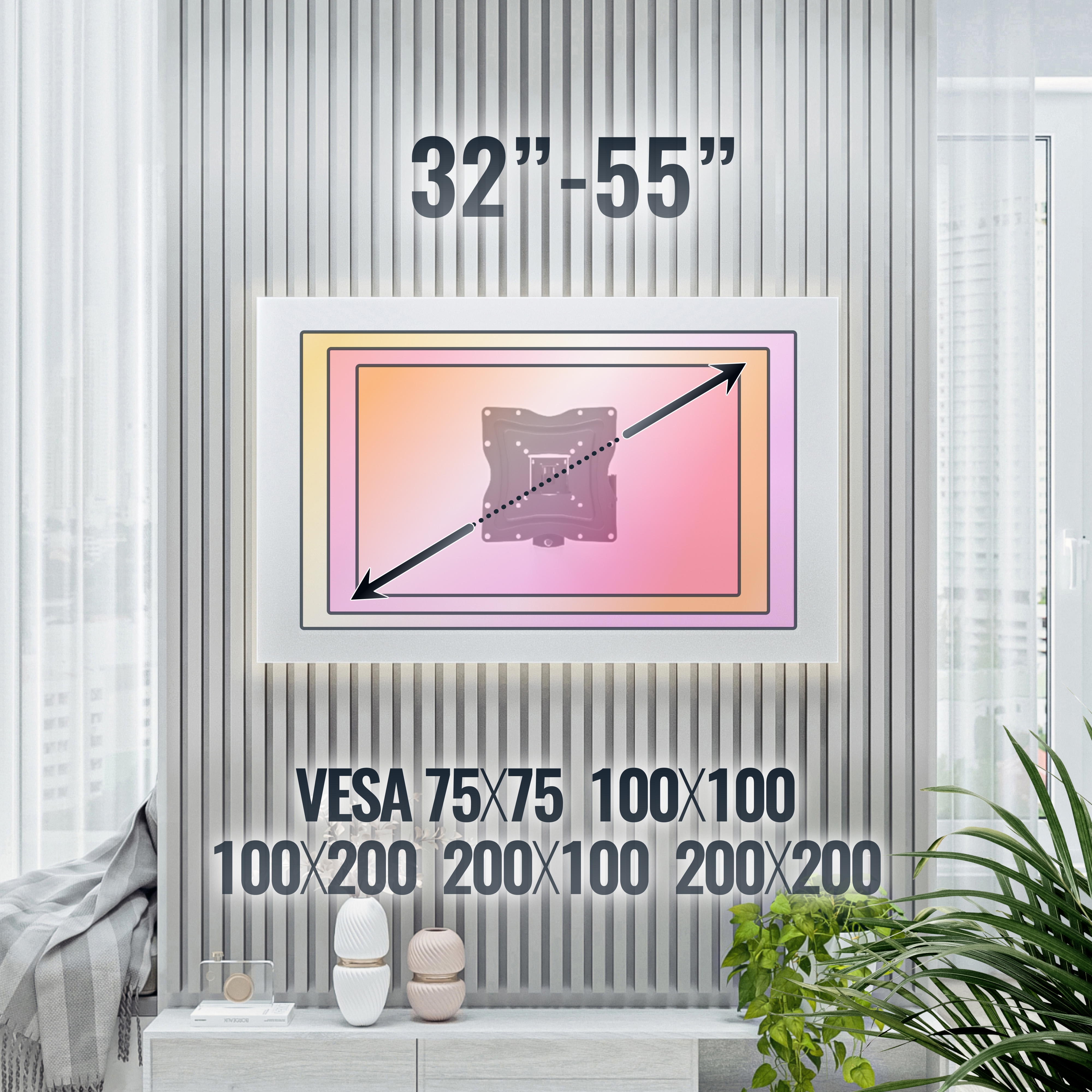 - Unterstützte VESA-Normen (in mm): 75x75 | 100x100 | 100x200 | 200x100 | 200x200